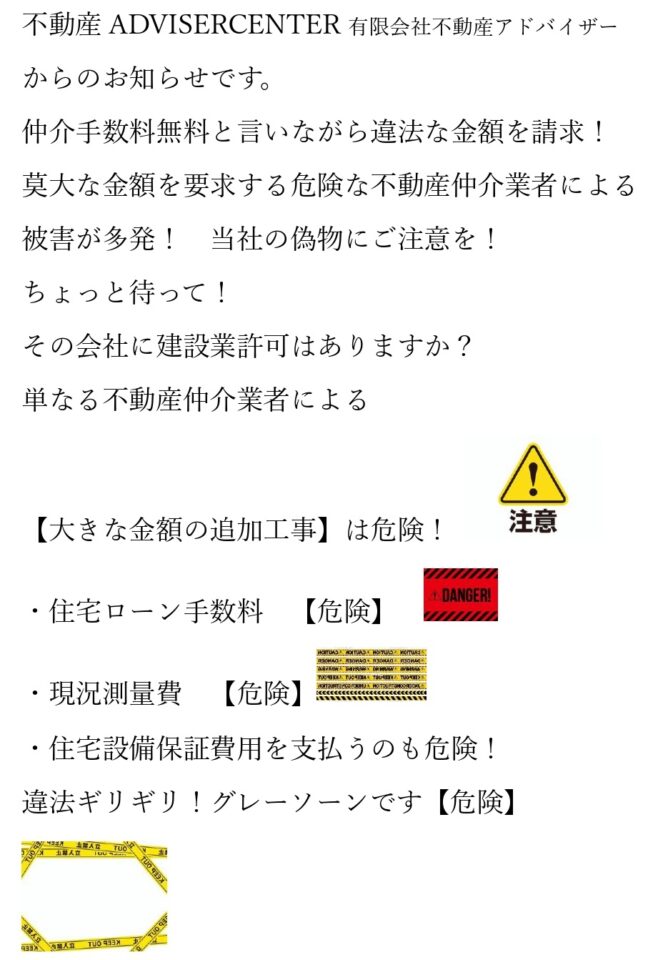 莫大な金額を要求する危険な不動産仲介業者による被害が多発! 当社の偽物にご注意を!